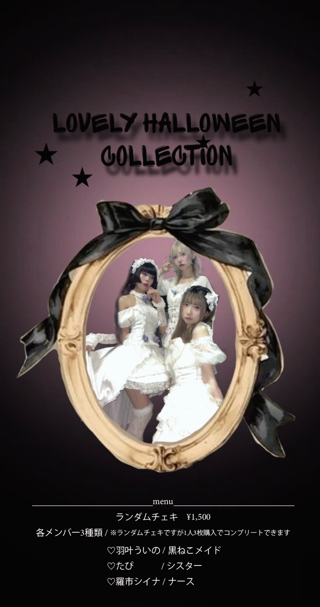 秘密倶楽部 LOVELY HELLOWEEN COLLECTION ランダムチェキ ¥1,500 各メンバー3種類 ※ランダムチェキですが1人3枚購入でコンプリートできます ♡羽叶ういの / 黒ねこメイド×3種 ♡たぴ / シスター×3種 ♡羅市シイナ / ナース×3種