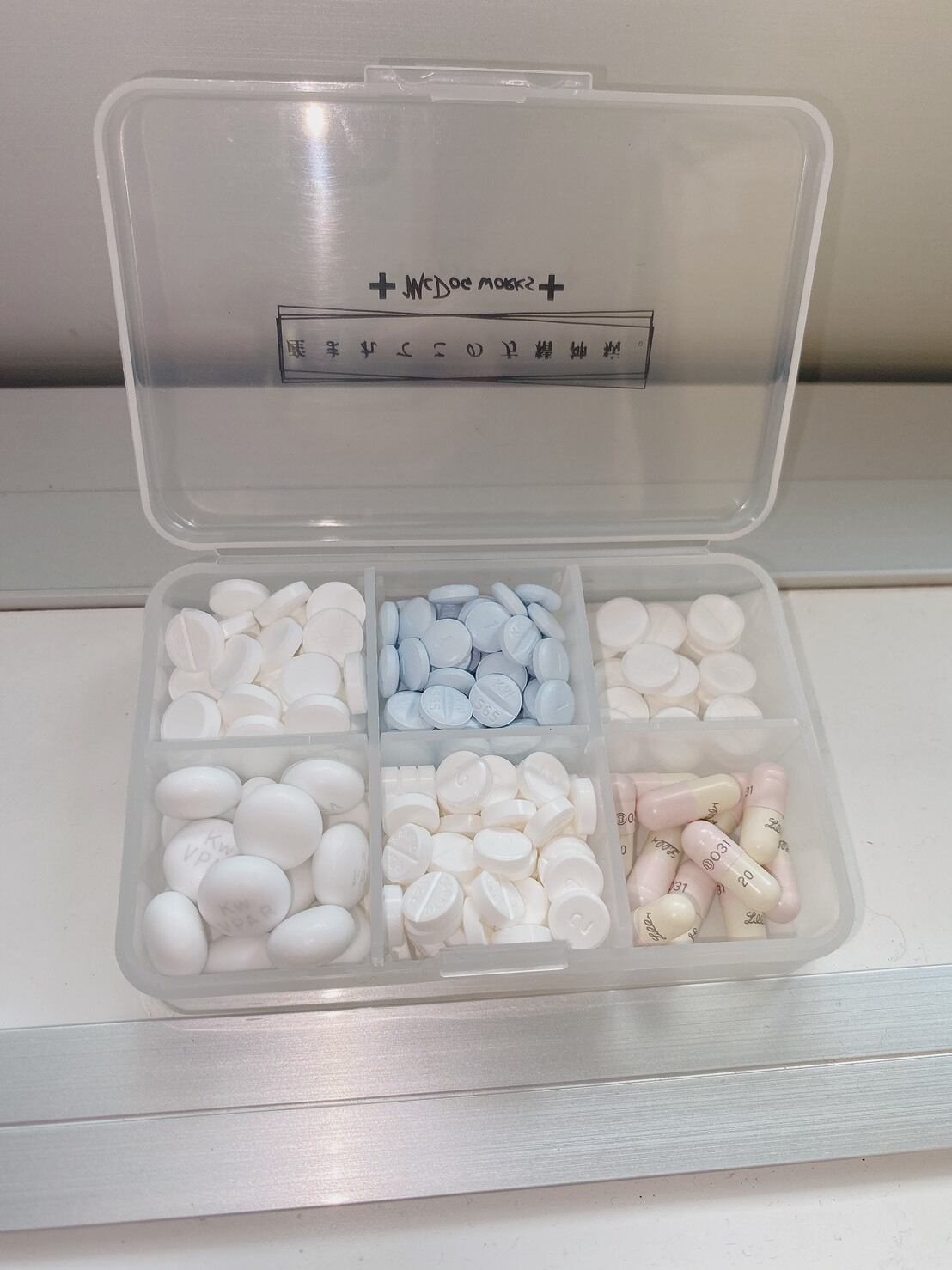 可変仕切り板2枚付きで、ポケットサイズの万能ピルケースです。